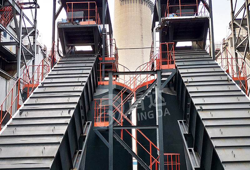 刮板输送机多用于现场渣仓与捞渣机设备呈90°直角布置时,捞渣机排出的渣落到二级刮板输送机转运至其他贮运设备。